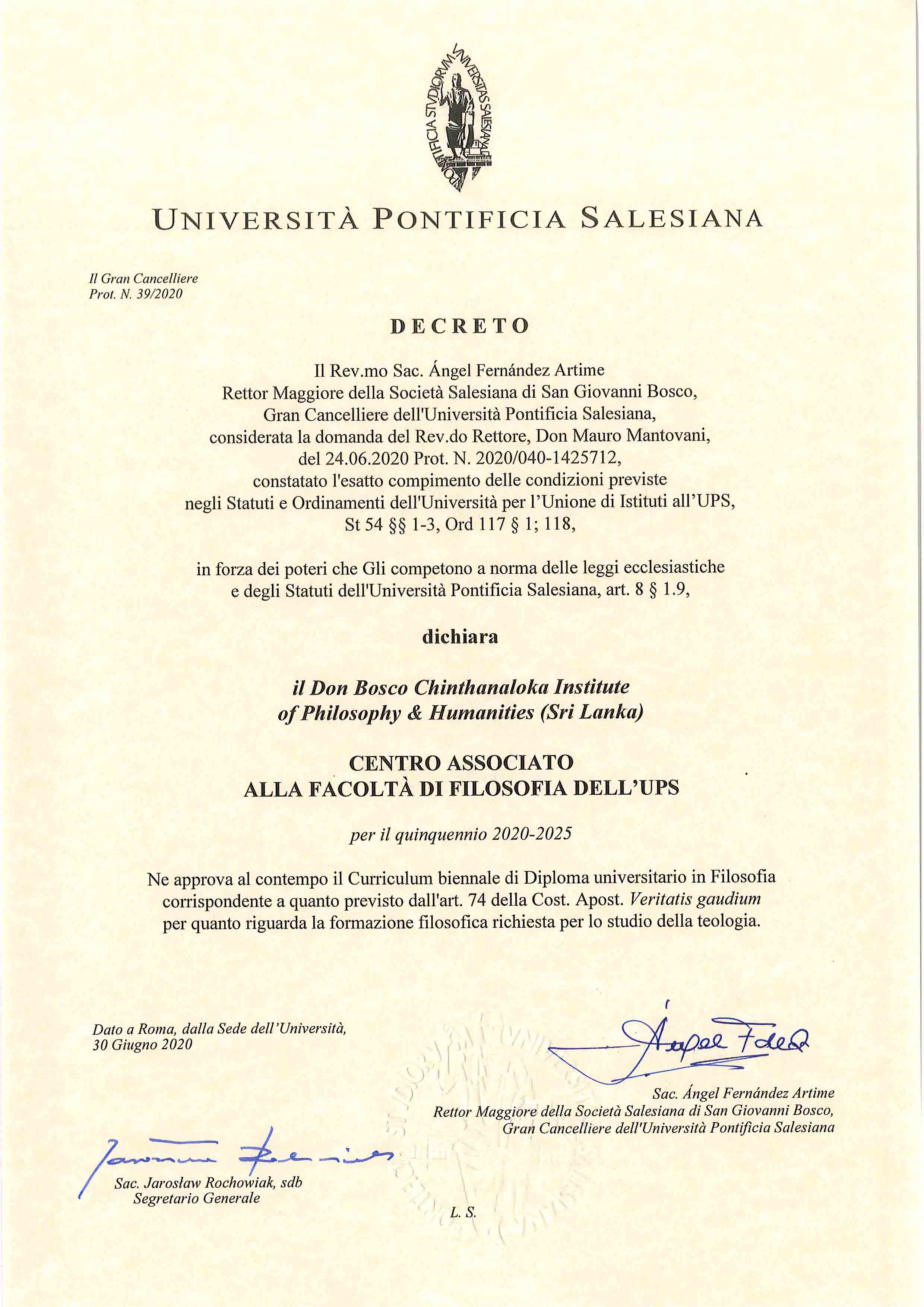 DON BOSCO CHINTHANALOKA INSTITUTE OF PHILOSOPHY AND HUMANITIES, ASSOCIATED CENTRE AT THE FACULTY OF PHILOSOPHY OF THE SALESIAN PONTIFICAL UNIVERSITY IN ROME, FOR